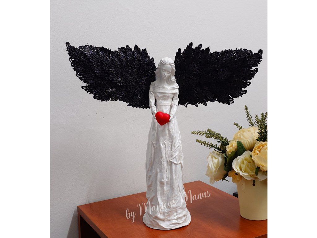 Anděl bílý s černými křídly, výška cca 49 cm. Jedná se o ruční práci, proto je každá soška originál.