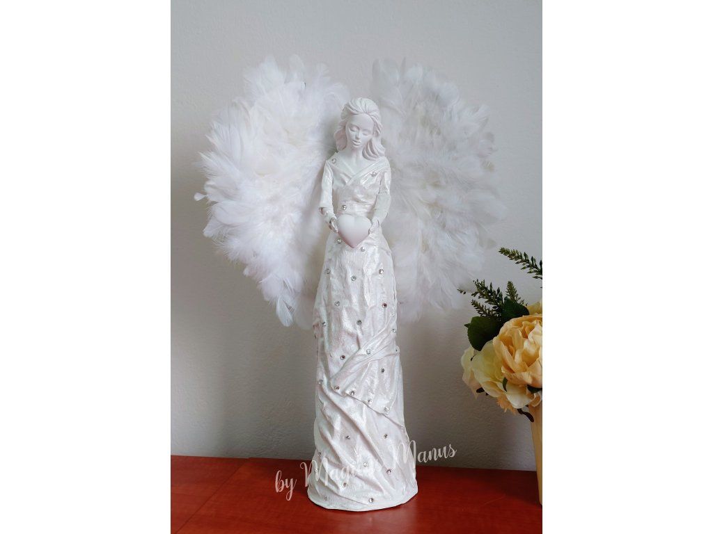 Anděl bílý s kamínky a křídly z pěříček, výška cca 45 cm. Jedná se o ruční práci, proto je každá soška originál