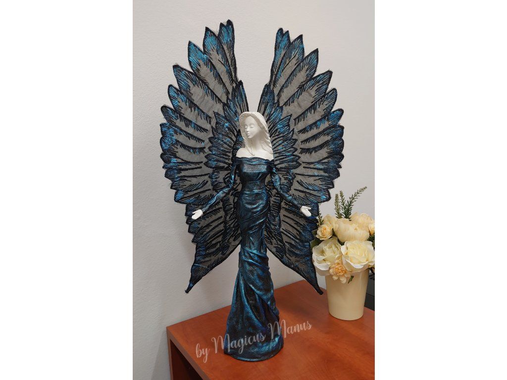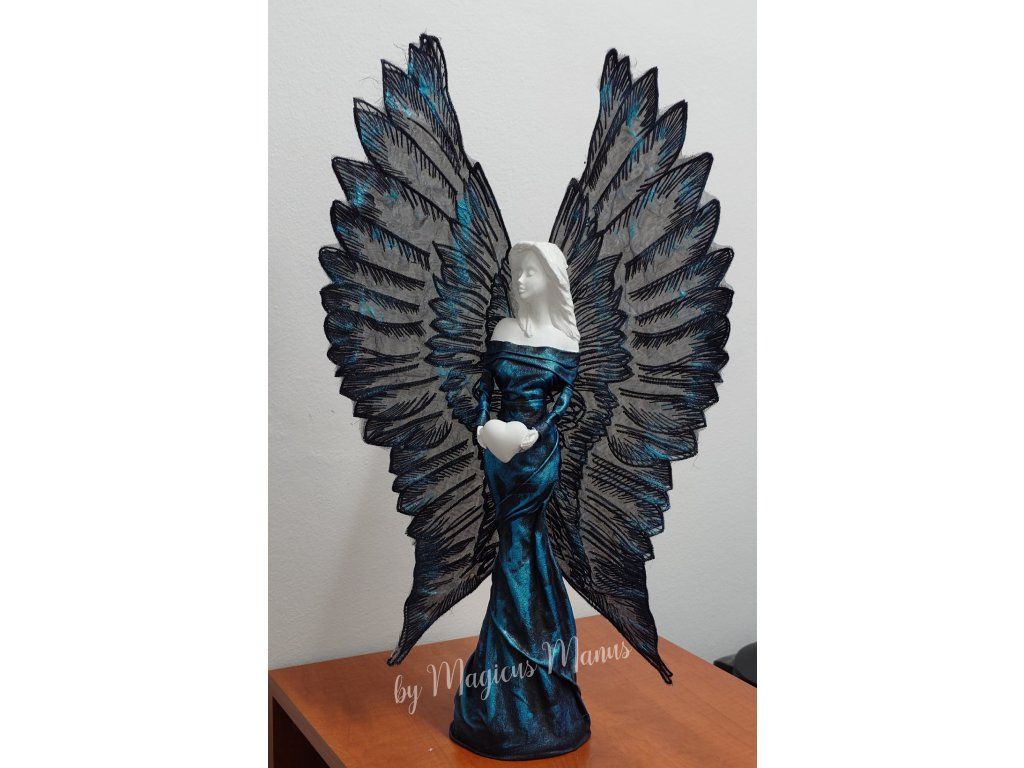 Anděl černomodrý o výšce 57 cm, varianta A - se srdíčkem, varianta B - bez srdíčka ( variantu prosím napište do poznámky při objednání ). Jedná se o ruční práci, proto je každá soška originál.