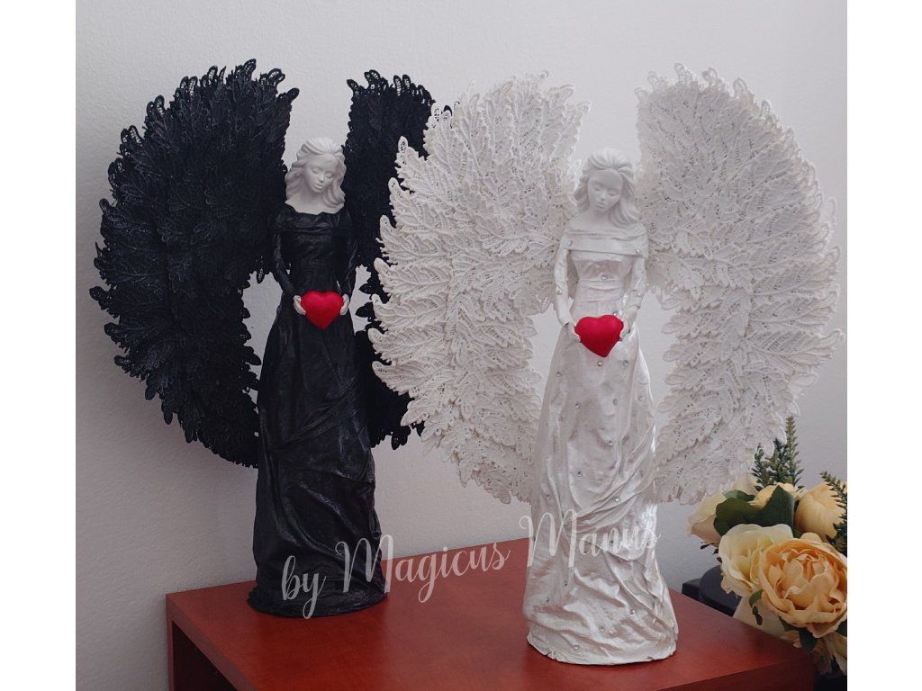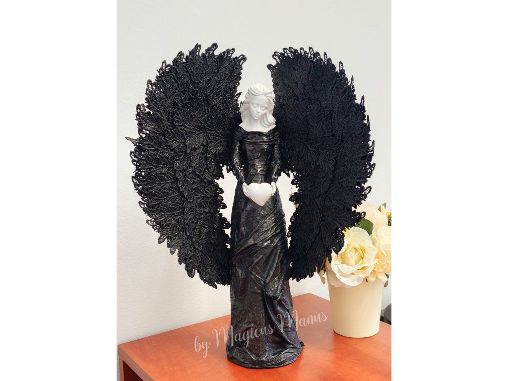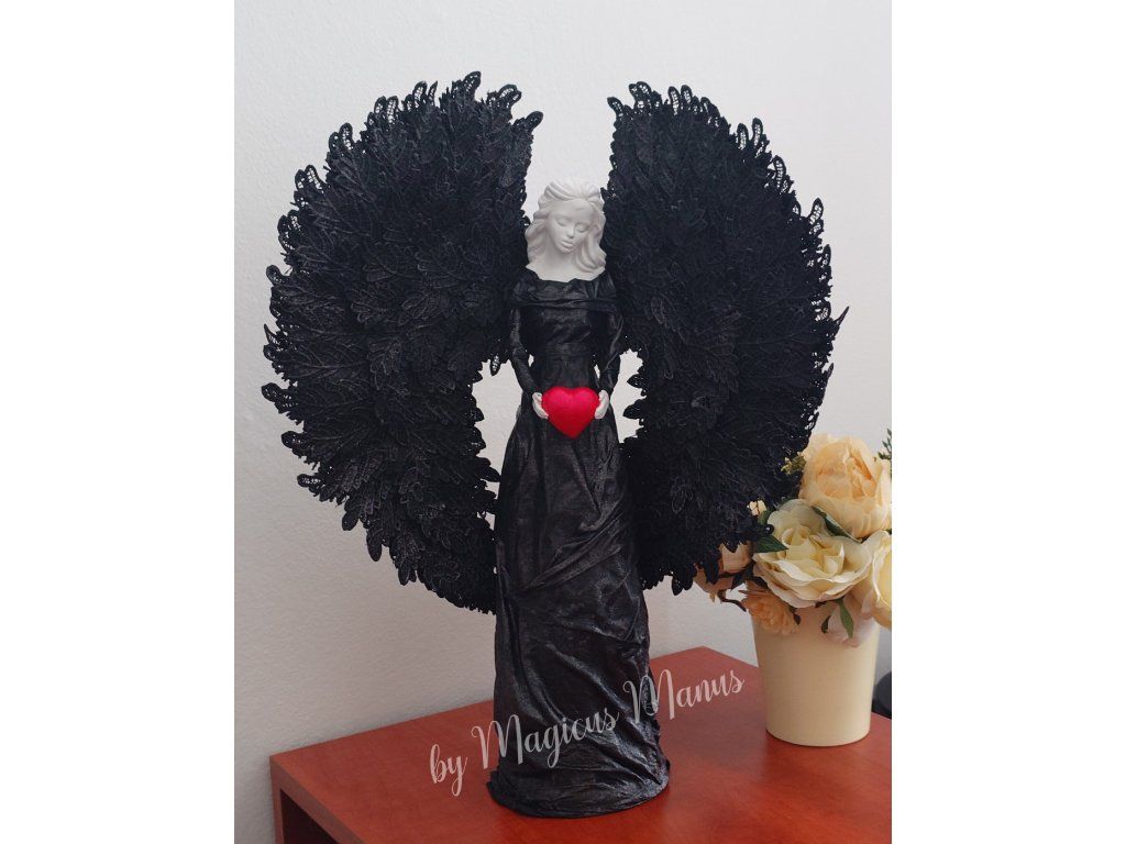 Anděl v černé o výšce 49 cm, barvu srdíčka prosím uvádějte do poznámky při objednání. Jedná se o ruční práci, proto je každá soška originál.