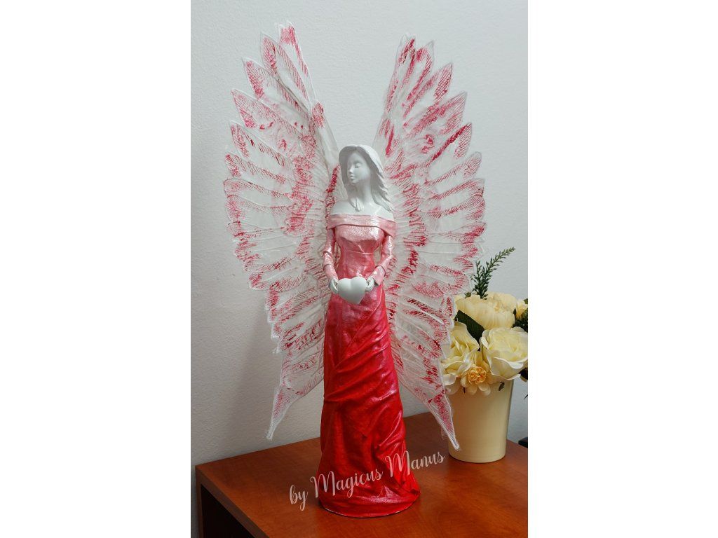 Anděl v červené o výšce 57 cm, jedná se o ruční práci, proto je každá soška originál.