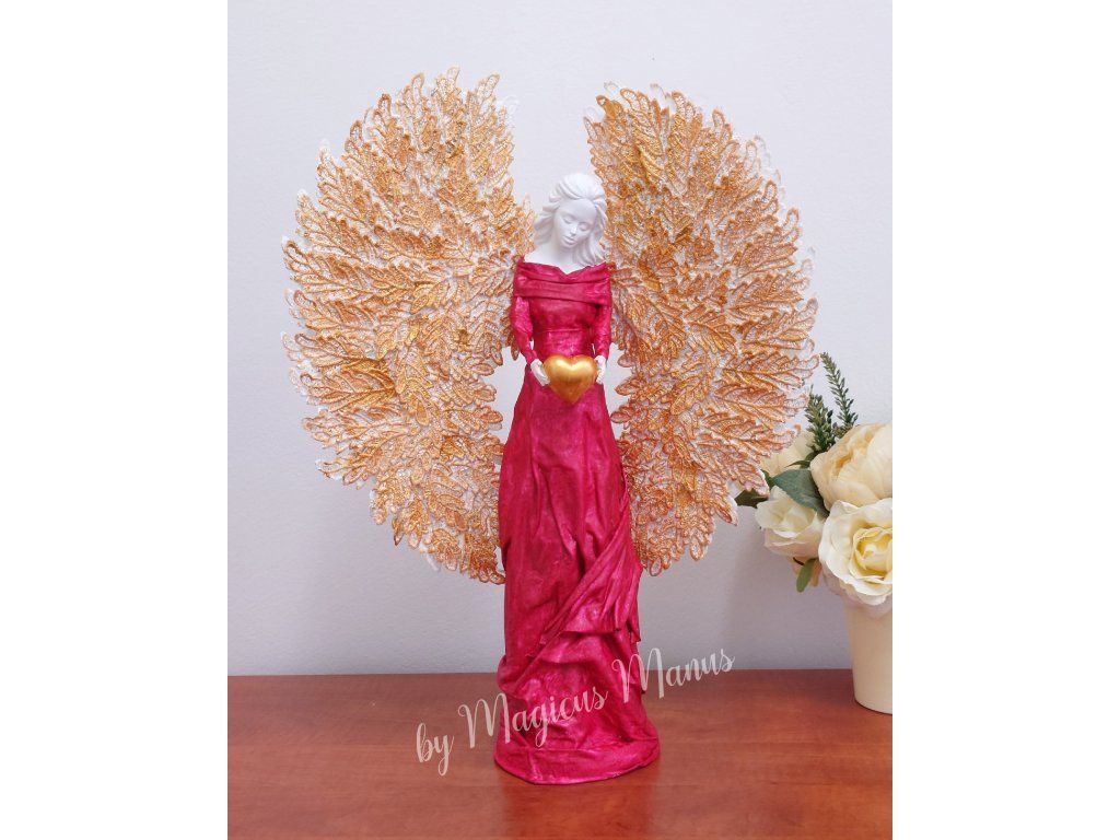 Anděl v červené se zlatými křídly o výšce 49cm, jedná se o ruční práci proto je každá soška originál