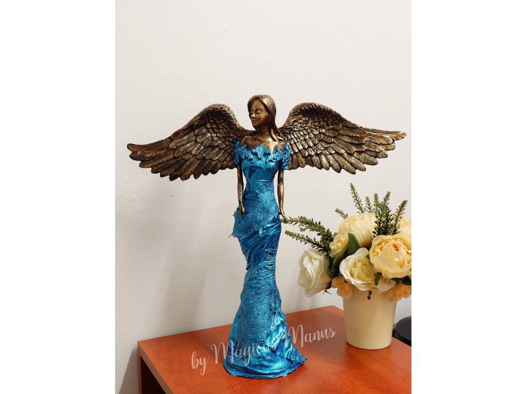 Anděl bronzovo modrý o výšce cca 49 cm, jedná se o ruční práci, proto je každá soška originál