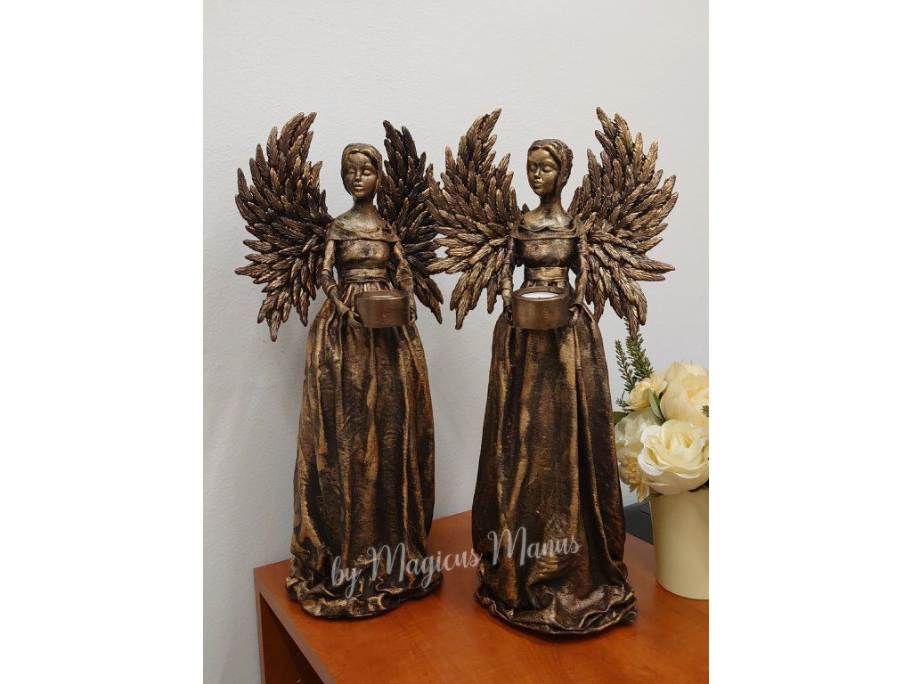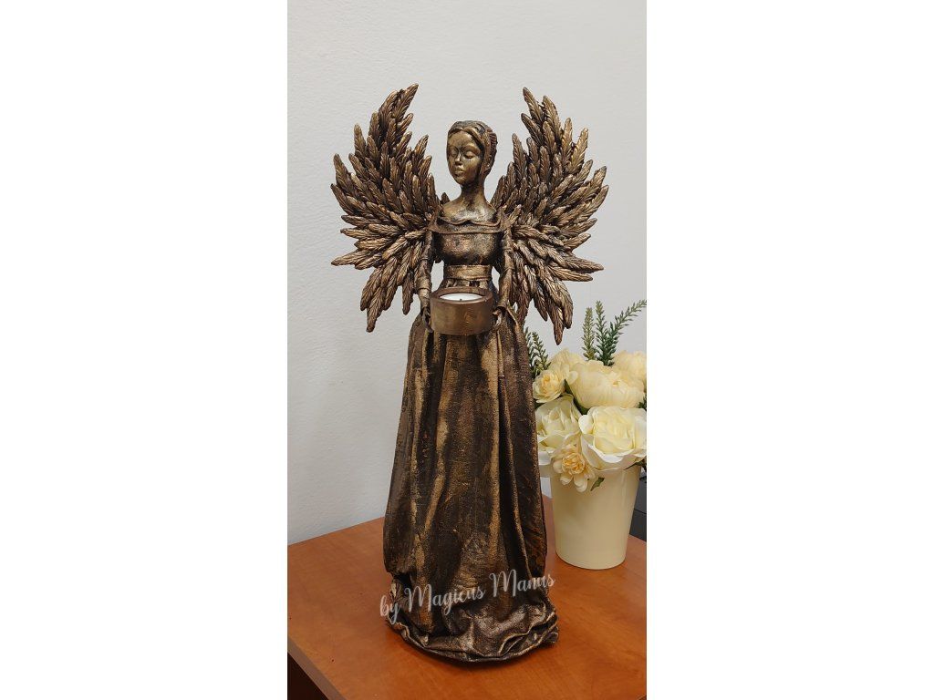 Anděl o výšce 52 cm v bronzové barvě se svícnem. Jedná se o ruční práci, proto je každá soška originál.