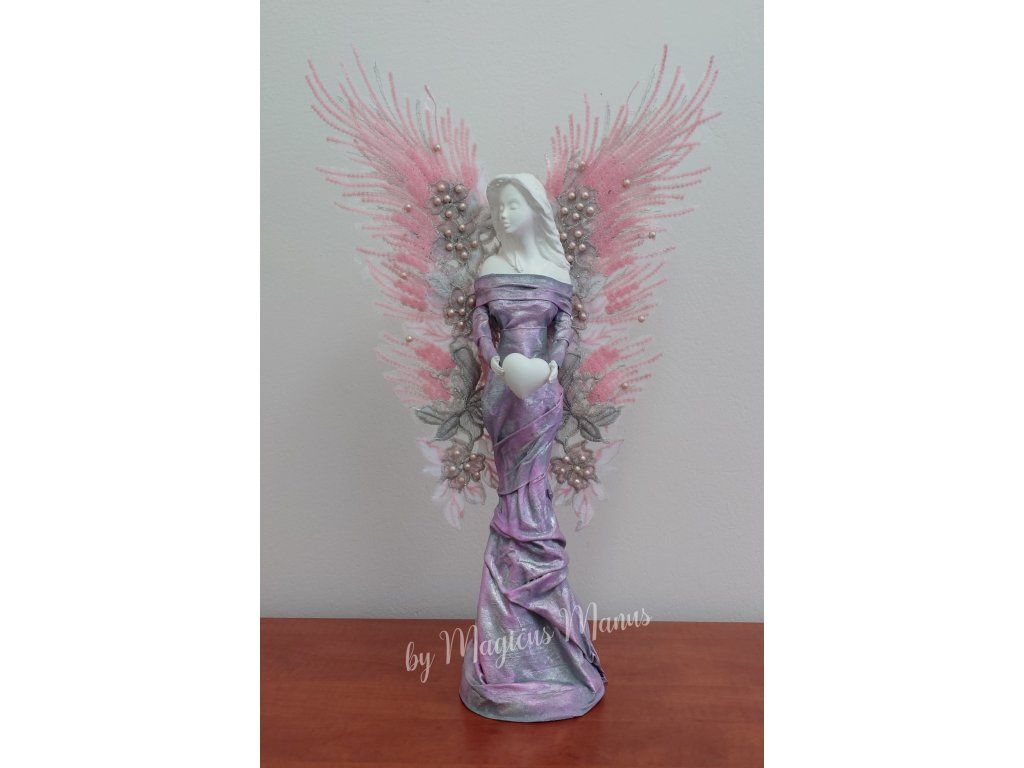 Anděl v šedo růžové o výšce cca 52 cm, jedná se o ruční práci, proto je každá soška originál