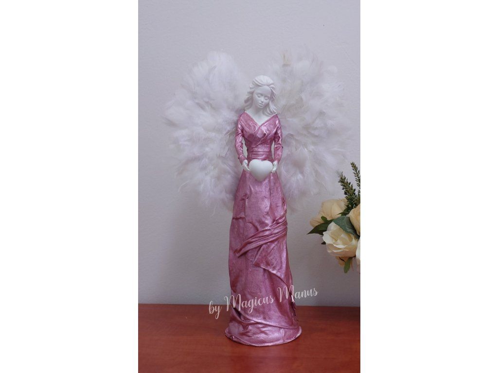 Anděl ve starorůžové s křídly z peříček, výška cca 52 cm. Jedná se o ruční práci, proto je každá soška originál