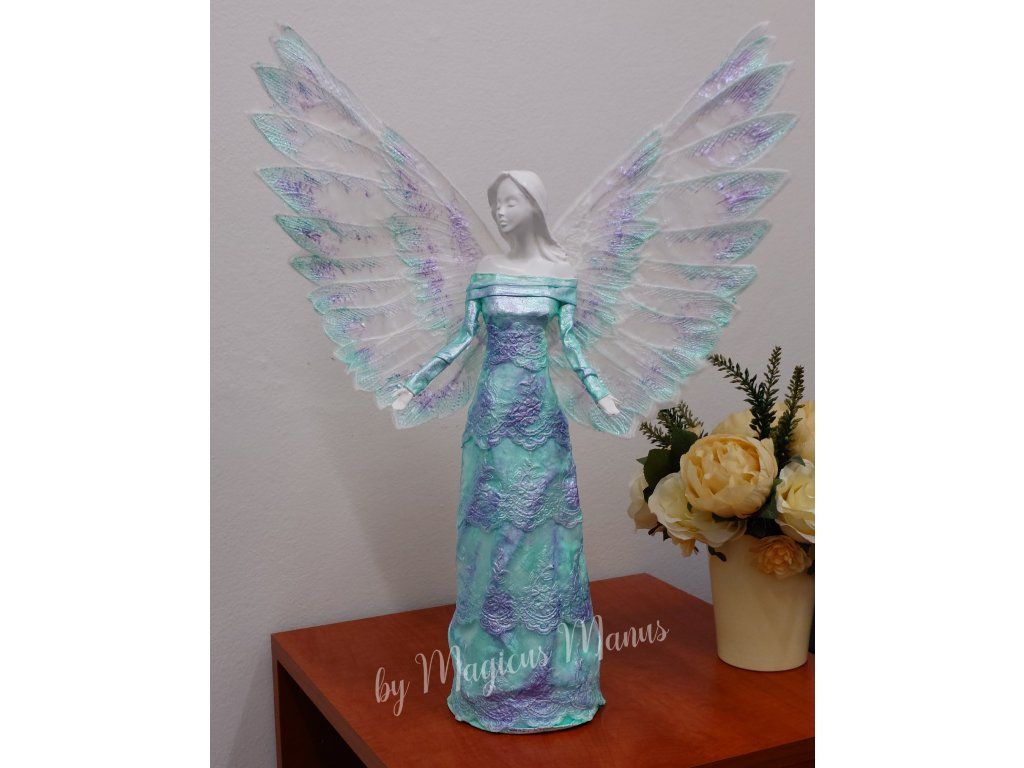 Anděl v tyrkysovofialové barvě s krajkovými šaty o výšce 55 cm, jedná se o ruční práci, proto je každá soška originál.