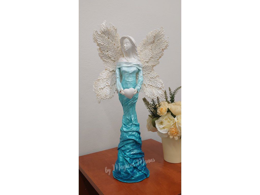 Anděl v tyrkysové o výšce cca 45 cm, jedná se o ruční práci, proto je každá soška originál