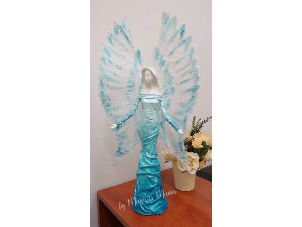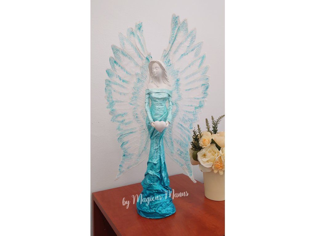Anděl v tyrkysové o výšce 57 cm, varianta A - se srdíčkem, varianta B - bez srdíčka ( variantu prosím uveďte do poznámky při objednání ). Jedná se o ruční práci, proto je každá soška originál