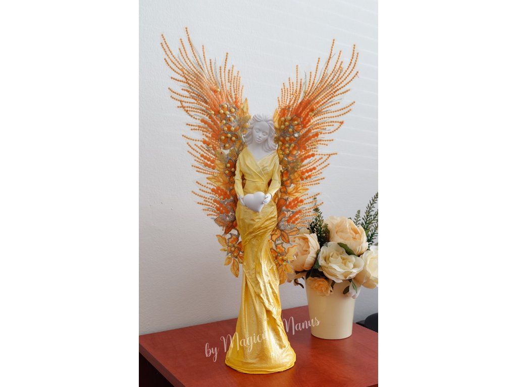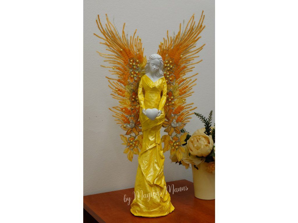 Anděl ve žluté o výšce cca 52 cm, jedná se o ruční práci, proto je každá soška originál