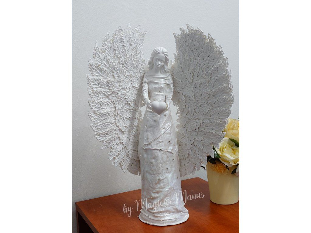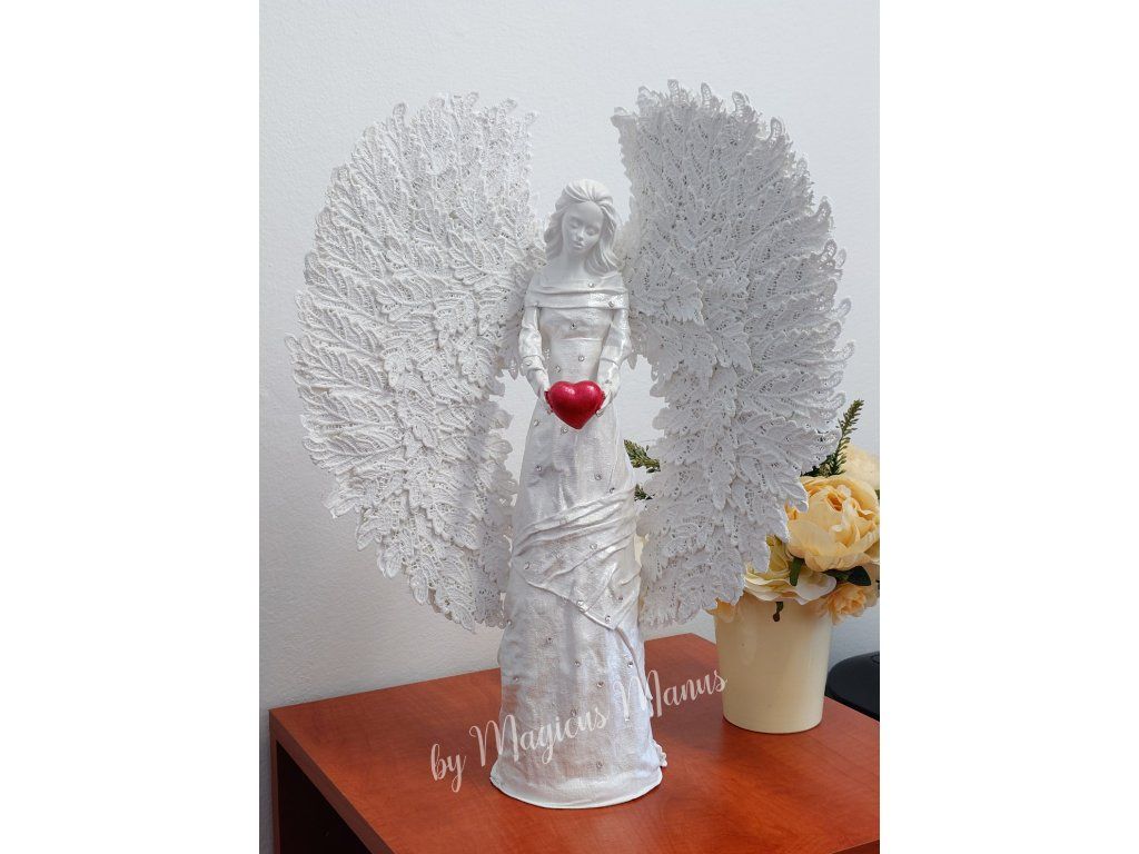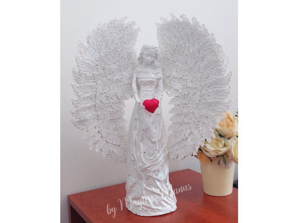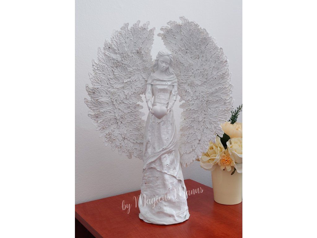 Anděl v bílé s kamínky o výšce 49 cm, barvu srdíčka prosím uvádějte do poznámky při objednání. Jedná se o ruční práci, proto je každá soška originál
