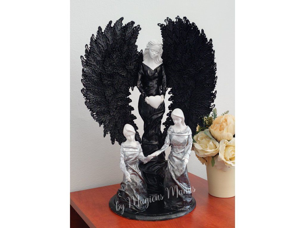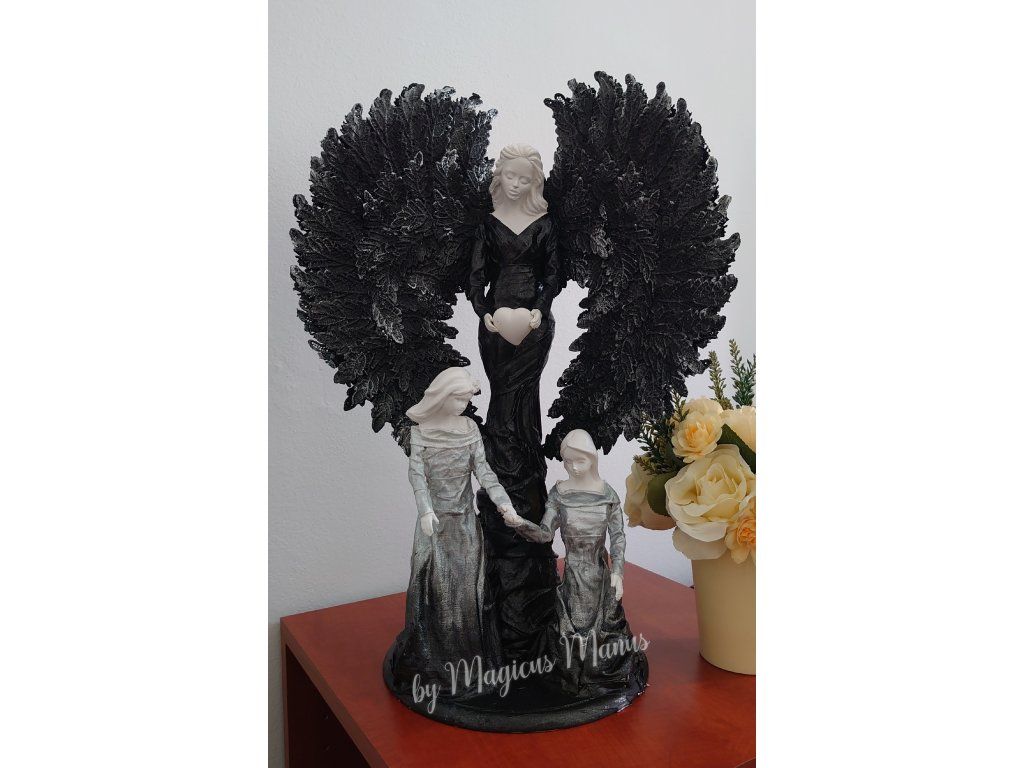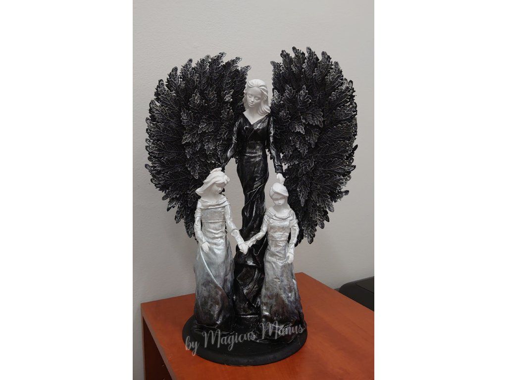 Sousoší v černo bílé, anděl a holčičky o výšce cca 54 cm. Sošky dětí je možné upravit na přání ( holčička/chlapec nebo dva chlapci ). Požadavek prosím uveďte do poznámky při objednání. Jedná se o ruční práci, proto je každá soška originál.