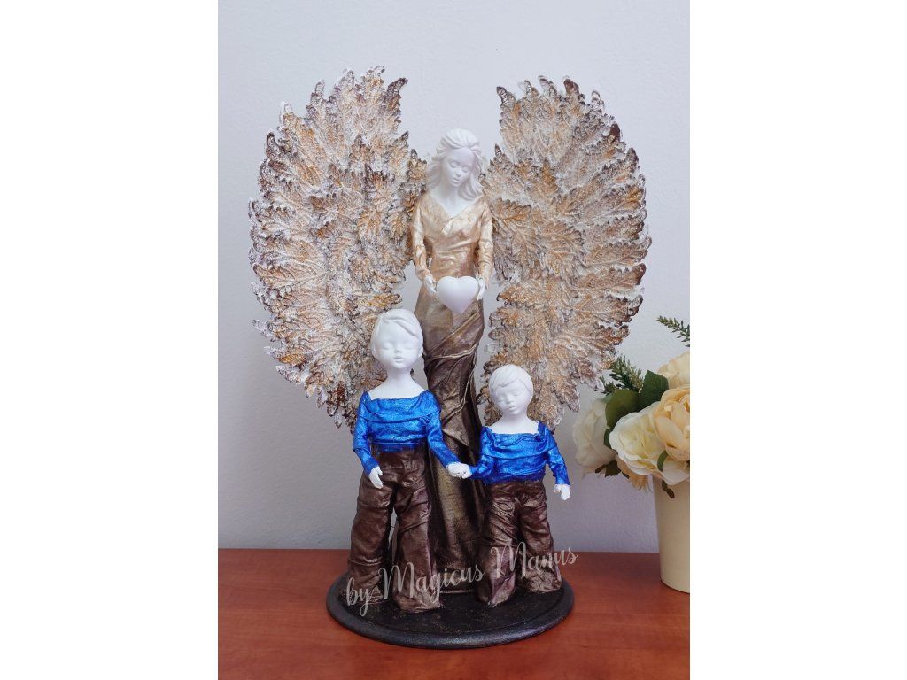 Sousoší v hnědo modré anděl a chlapci, výška cca 54 cm. Sošky dětí je možné upravit na přání ( dvě holčičky nebo holčička/chlapec ), lze upravit i barevná kombinace, požadavek prosím uveďte do poznámky při objednání. Jedná se o ruční práci, proto je každá soška originál