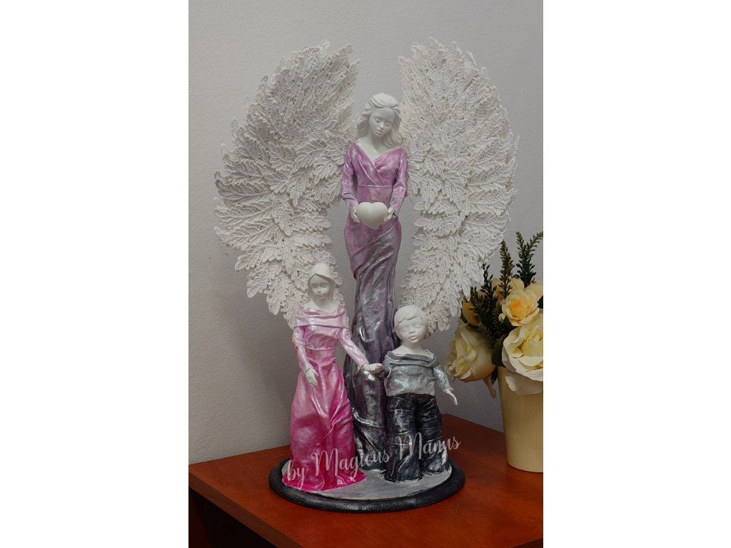 Sousoší v růžovo šedé anděl, holčička a chlapeček, výška cca 54 cm. Sošky dětí je možné upravit na přání ( dvě holčičky nebo dva chlapci ), lze upravit i barevná kombinace, požadavek prosím uveďte do poznámky při objednání. Jedná se o ruční práci, proto je každá soška originál