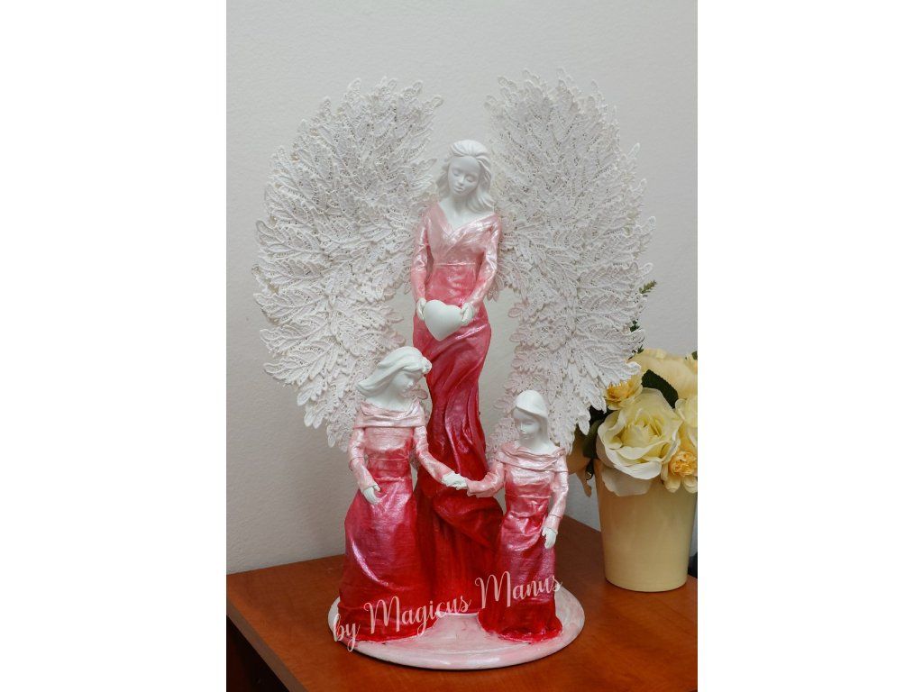 Sousoší v červené anděl a dvě holčičky, výška cca 54 cm. Sošky dětí je možné upravit na přání ( holčička/ chlapec nebo dva chlapci ), požadavek prosím uveďte do poznámky při objednání. Jedná se o ruční práci, proto je každá soška originál