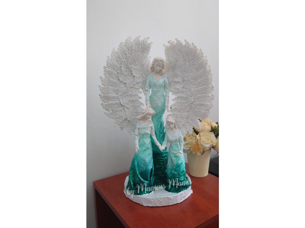 Sousoší v zelené anděl a dvě holčičky, výška cca 54 cm. Sošky dětí je možné upravit na přání ( holčička/ chlapec nebo dva chlapci ), stejně tak barevná kombinace. Požadavek prosím uveďte do poznámky při objednání. Jedná se o ruční práci, proto je každá soška originál